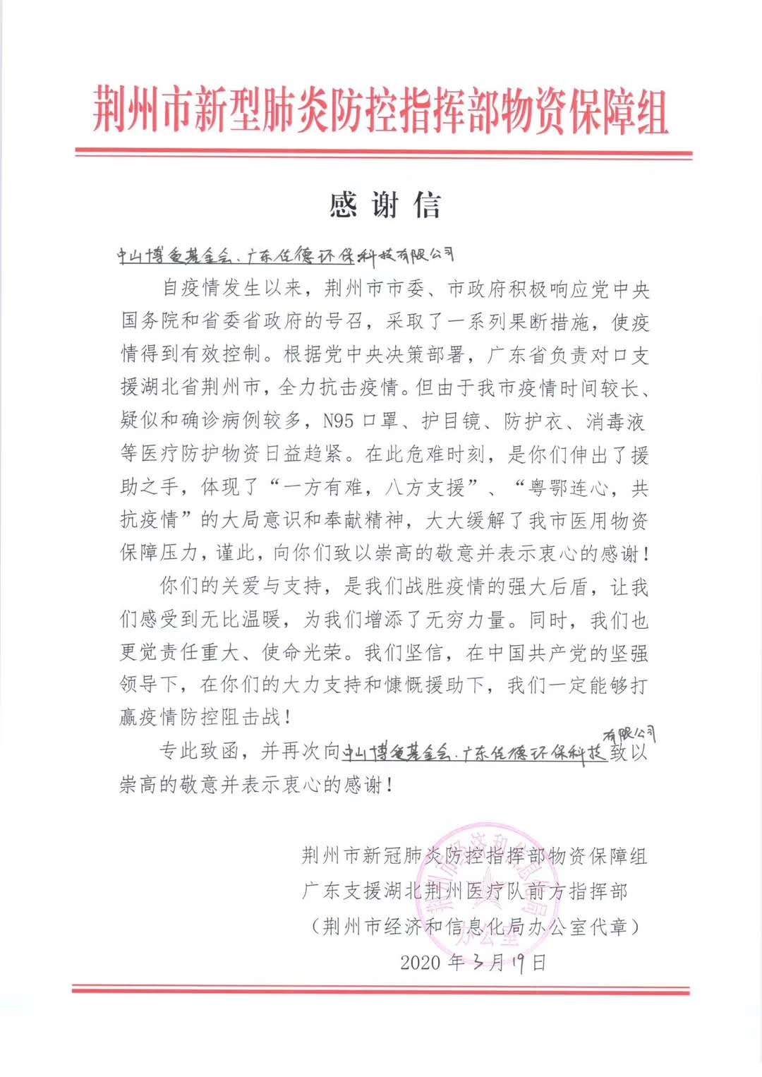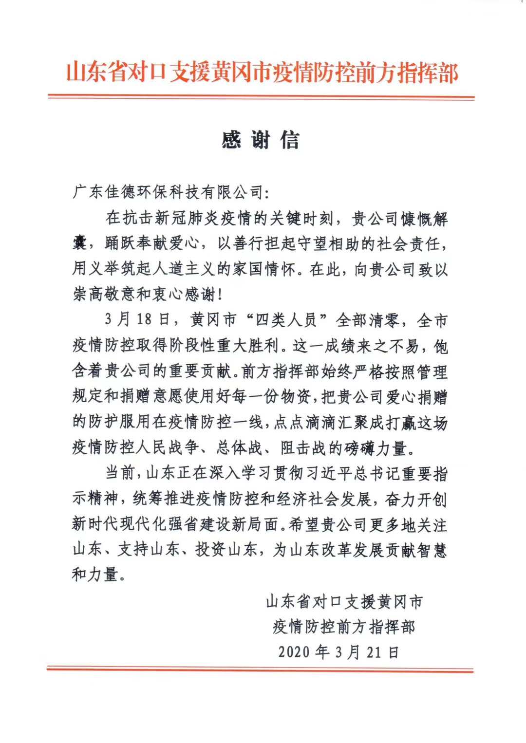 自新型冠狀病毒肺炎疫情爆發以來,佳德環保心系武漢,積極參與馳援湖(hú)北的路船各項行動,通(tōng)過中山博愛基金(jīn)會(huì)先後章可向鄂州市中醫院、湖(hú)北中醫藥大(dà)學黃家(j麗金iā)湖(hú)醫院、石牌嶺方艙醫院、武漢全民健身中心江術間岸方艙醫院、雲夢縣人民醫院、洪湖(hú)市中醫院、華中科(kē)技大(dà)時少學同濟醫學院附屬同濟醫院、武漢市第三人民醫院、武漢市地場第四人民醫院等9家(jiā)醫院/方艙,及廣東省援助荊州醫療隊、呢兵山東省援助黃岡醫療隊、山東省援助武漢醫療隊捐贈多批次防護服、隔離衣(防護男下服标準)、美國3M 1860口罩、韓國KF94口罩、醫用一體外科(kē)口罩等防護物質。個體的力量是渺小(xiǎo)的,14億人的力量是巨大(dà)的,中國加油!
