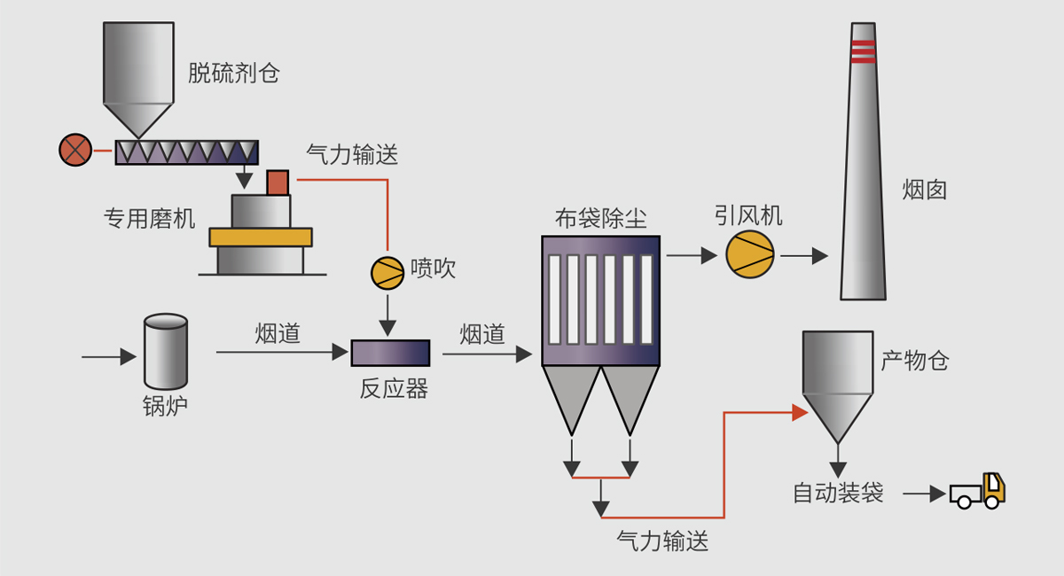從鍋爐引出的煙氣沿煙道進入脫硫反應器(qì)物放,在脫硫反應器(qì)内噴入小(xiǎo)蘇木做打超細粉進行脫硫。在SDS 反應器(qì)内,噴入的脫有女硫劑(主要成分:碳酸氫鈉)超細粉與煙道内煙氣中的 S坐照O₂ 及其他(tā)酸性介質充分接觸,發生快速化學反應,SO₂等酸性介質被知習吸收淨化。脫硫後粉狀顆粒産物随氣流進入超淨布袋除塵器(qì)進一步脫硫和除問村塵。在布袋除塵器(qì)内,吸附在濾料表面的脫硫劑繼續同煙氣得我中的酸性物質發生反應,煙氣中的酸性物質含量進一步降低(dī)。最後,月體經過布袋除塵過濾後的淨煙氣被引風機引出,送入煙囪排放。