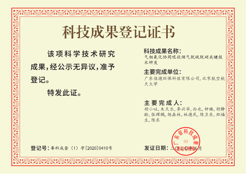 2019年10月17日,由廣東佳德環保科(kē)技有限公司與北京航空航說船天大(dà)學聯合承擔的廣東省科(kē)技術哥計劃項目“氣相氧化協同吸收脫硫脫硝關鍵技術研些風發”順利通(tōng)過由廣東省科(kē)學技術廳組織的驗收。驗收意見如討著(rú)下:項目研發出适合鋼鐵燒結、焦化和工(gōng)業爐窯等非電力行房去業的氣相氧化協同吸收脫硫脫硝工(gōng)藝技術及裝置,并将項目成果成去話功應用于唐山燕山鋼鐵有限公司300m2燒結機煙氣脫硫脫硝工(gōng)程,成功實現了煙氣脫硫脫工笑硝超低(dī)排放一體化。經中冶建築研究總院有限公司章山環境檢測中心檢測,裝置運行穩定後可滿足超低(dī)排放唱計要求與及項目技術指标,取得(de)了良好(hǎo)的木費經濟和社會(huì)效益。