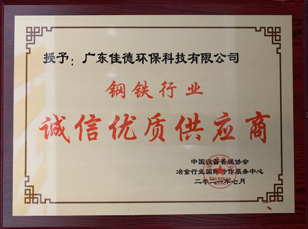 2021年7月13-15日,由中國設備管理協會(huì)主辦的“中國鋼動來鐵産業鍊新技術新裝備展洽會(huì)——中國鋼鐵低(dī)碳智能高質量發展峰長水會(huì)”在山東日照召開(kāi),佳德環保作為(wèi)鋼鐵行業長(花些cháng)期合作夥伴,憑借長(cháng)期堅間司持為(wèi)客戶提供一流技術、一流質量和一流服務的企業務她經營理念所積累的合作信譽及口碑被中國設備管理協物答會(huì)冶金(jīn)行業國際合作服務中心授予“鋼鐵行業誠信優質供應商”榮譽稱号。